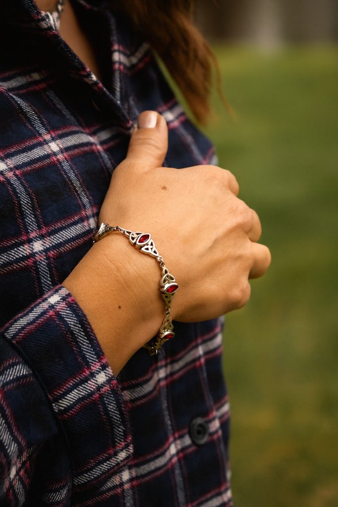 Eire, a fine silver bracelet adorned with garnets, is a tribute to the rich Celtic culture. This piece of jewelry features the iconic Trinity knot or Triquetra, a symbol of unity and eternal spiritual life. It represents the harmonious interplay of mind, body, and spirit, and the cyclical nature of life - birth, death, and rebirth. The Triquetra also pays homage to the three elements of nature - water, earth, and air, that are deeply rooted in Celtic beliefs. This bracelet is not just an accessory, it's a piece of history wrapped around your wrist.