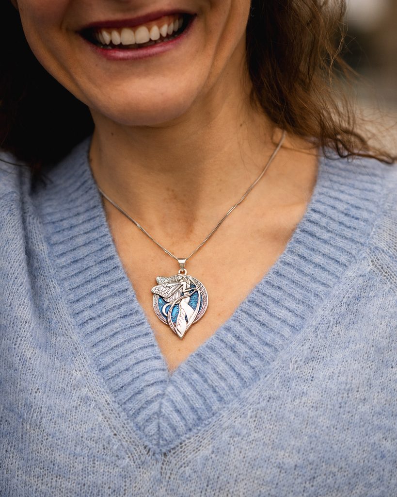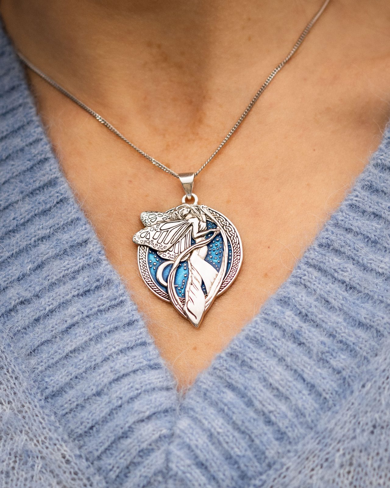 Step into a realm of enchantment with our Midnight Fairy Sterling Silver Pendant. Crafted from the finest silver, this exquisite piece is a creation of renowned artist Courtney Davis. The pendant features a delicate fairy, bathed in the ethereal glow of moonlight, captured in stunning enamel. This unique piece of jewelry is not just an accessory, but a gateway to the mystical world of fantasy. Wear it to add a touch of magic to your everyday style or gift it to a fantasy lover to make their dreams come true.