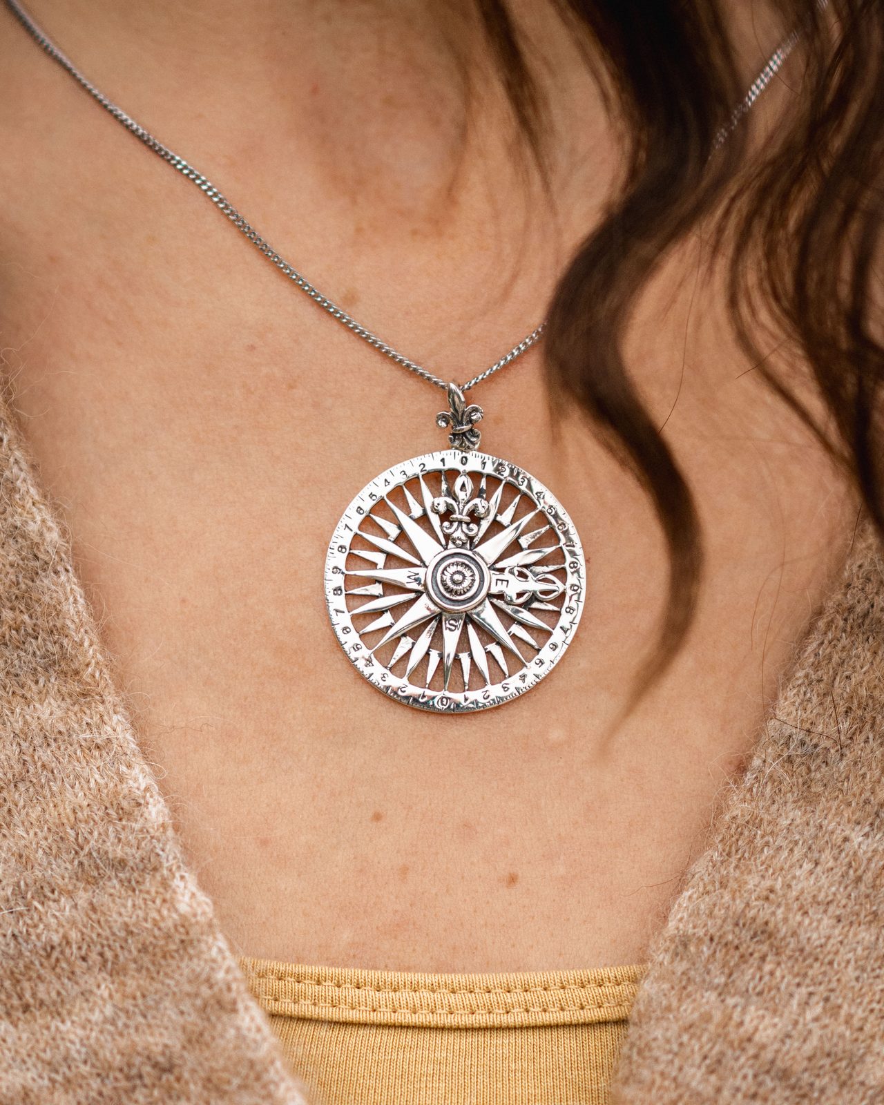 Nautical Compass, Sterling Silver Pendant - a tribute to the ancient seafaring instrument, symbolizing the countless voyages across the globe. This fine silver pendant, intricately designed, is a beacon for sea lovers, embodying the essence of unity and direction. Let it guide you, like the sailors of old, through stormy seas and towards the tranquility of home. With a size of 3.2 cm (1.25") W x 4.1 cm (1.6") H, this .925 sterling silver pendant is not just a piece of jewelry, but a journey you carry with you.