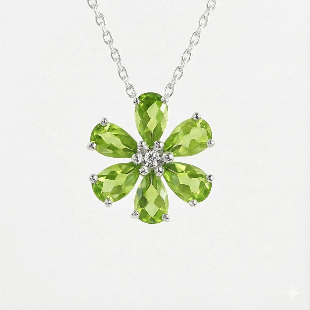 Přívěsek Olivínový květ působí jako drobná jarní hvězda na Vašem dekoltu. Šest zelených lístků z olivínu vytváří zářivý květ, který se třpytí při každém pohybu. Stříbro 925 dodává šperku čistotu a eleganci, zatímco svěží zelená barva kamene vnese do Vašeho stylu lehkost a radost. Součástí šperku je jemný stříbrný řetízek, takže jej můžete začít nosit ihned.