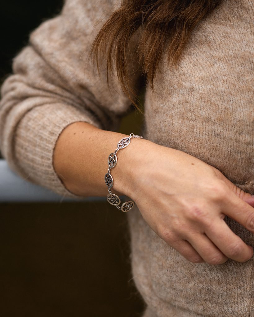 Unleash the Mysteries of the Cosmos with Our Silver Pentagram Pentacle Bracelet. This fine silver bracelet, adorned with the intricate design of a pentagram and pentacle, serves as a symbol of spiritual connection and protection. Each detail is a testament to the craftsmanship and dedication poured into creating this captivating piece. Whether you're drawn to Wicca, Paganism, or simply appreciate the esoteric allure, this bracelet is the perfect way to express your inner beliefs. It's a thoughtful gift for a fellow spiritual seeker or a cherished addition to your own collection. Details: